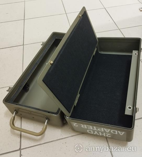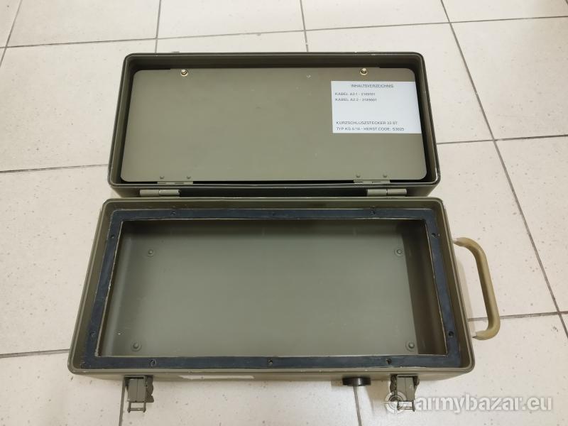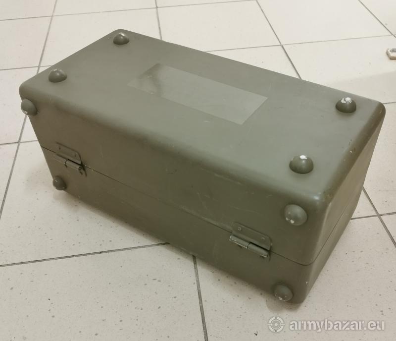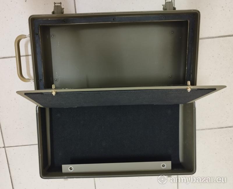 Opis: Sprzedam ładniutką skrzynkę metalową z demobilu. Dwie komory, w tym jedna zamykana pokrywą na dwa zatrzaski przyciskowe. Wymiary zewnętrzne korpusu (dł.x szer.x wys.) 457x220x195 mm. Szerokość z zamkami i nóżkami 245 mm. Wysokość z nóżkami 220 mm. Wymiary komór wewn. (orientacyjne): szerokość 200 i 228 mm, głębokość 98 i 95 mm, długość obu komór 440 mm. Czysta jak nowa. Nawet pachnie specyficzną chemią, której zapach jest bliski lizolowi. Cena sugerowana 200 zł plus przesyłka PP lub odbiór w Warszawie.