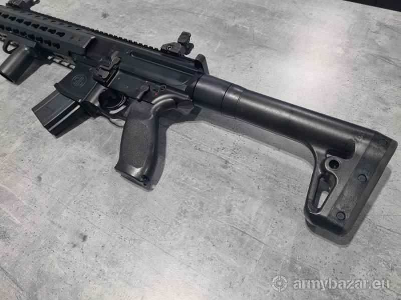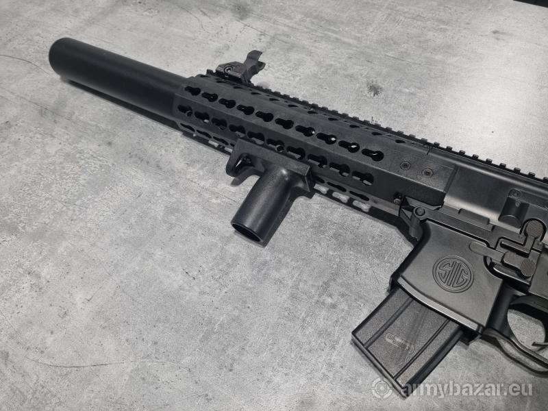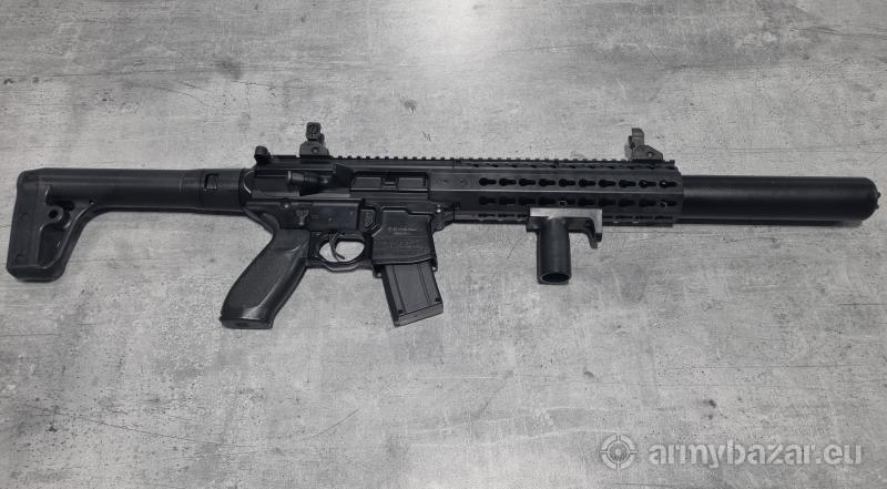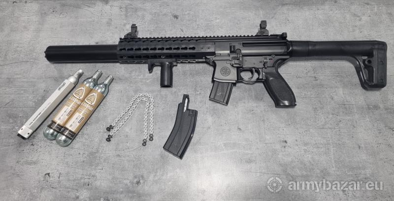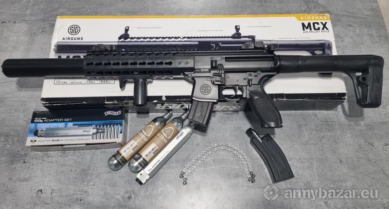 Opis: Wiatrówka karabinek Sig Sauer MCX 4,5 mm mało używany w zestawie przyrządy celownicze składane, przejsciówka na małe kapsuły CO2 2x12g, 2 kapsuły 88g i dodatkowy magazynek z 2 dodatkowymi taśmami w pełni sprawy. Zasilany kapsułą CO2 karabinek wiatrówkowy z gwintowaną lufą, będący wierną repliką Sig Sauera MCX. Replika wykonana została z metalu oraz tworzywa sztucznego. Korpus, lufa zewnętrzna, przyrządy celownicze oraz mechanizm wewnętrzny zostały wykonane z metalu. Z wytrzymałego tworzywa sztucznego wykonano chwyt przedni, magazynek, kolbę oraz drobne elementy. Na korpus naniesiono oznaczenia producenta palnego pierwowzoru Sig Sauer.